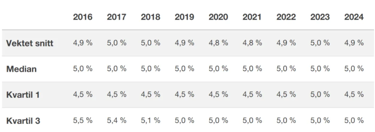 Nivået på markedsrisikopremien i det norske markedet for 2024 ligger på 5.0 %. Størrelsen på markedsrisikopremien har vært stabil i perioden undersøkelsen har vært gjennomført og 89% av respondentene oppgir i årets undersøkelse at de ikke har endret benyttet markedsrisikopremie fra i fjor.