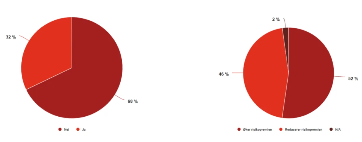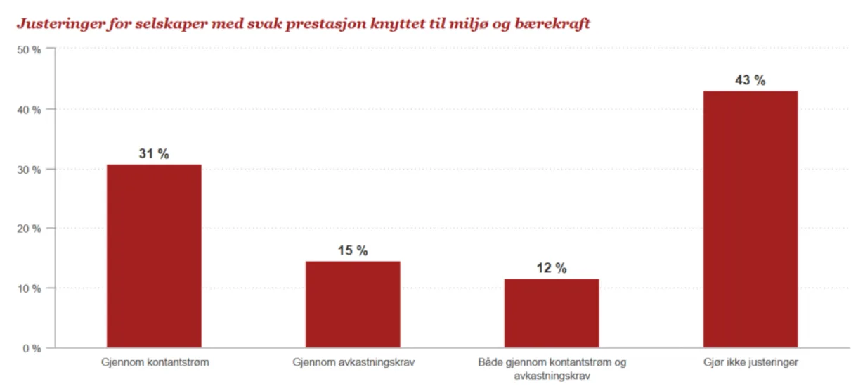 Majoriteten av respondentene justerer kontantstrømmen og/eller avkastningskravet for selskaper med svake prestasjoner tilknyttet miljø og bærekraft (57 %). Dette er noe lavere enn resultatene for tidligere år.